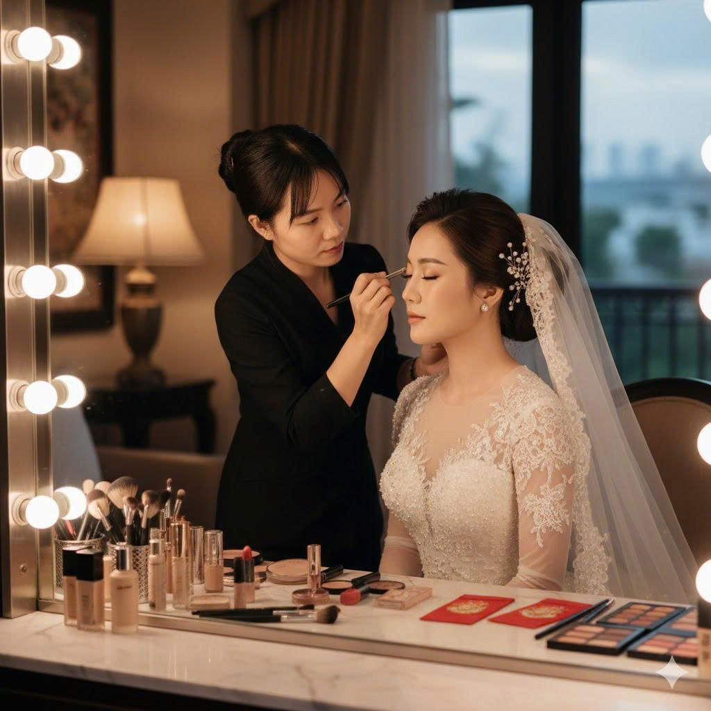 Trang điểm cô dâu tự nhiên – sang trọng theo concept. Lớp nền mịn, giữ lâu, mắt long lanh và môi bền màu giúp bạn rạng rỡ trong mọi khoảnh khắc quan trọng.